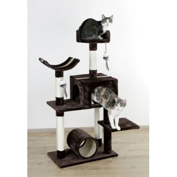 Das gebogene Kratzbrett oder der Kratztunnel sind außergewöhnliche Extras, die viel Spaß bei der Krallenpflege bieten und Ihre Möbel und Tapeten vor dem natürlichen Kratztrieb Ihres Haustieres schützen. Zusätzlich befinden sich zwei weitere Liegenflächen, eine Höhle und ein kleines Spielzeug am Kartzbaum, die zum spielen, ausruhen und beobachten einladen.