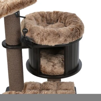 Der MORE Kratzbaum George eignet sich dank seiner großzügigen Liegeflächen ideal als Ruheoase und Spielwiese für große Katzen. Die weichen Liegekissen sind aus kuschelweichem und luxuriösem Plüsch gefertigt und lassen sich bei Bedarf leicht abnehmen und per Hand waschen. Die ca. 12cm breiten Kratzstämme sind mit robustem dunkelbraunem Seil umwickelt, was dem Kratzbaum seine edle Optik verleiht. Darüber hinaus bietet der MORE Kratzbaum George eine bequeme Hängematte sowie großzügige Höhle, sodass beim täglichen Beobachten und Entspannen sicherlich keine Langeweile aufkommt. Die Bodenplatte des Kratzbaums ist mit kleinen Gummifüßen ausgestattet und schützt so den Boden. Die eleganten dunkelbraunen Farbtöne und die qualitativ hochwertige Verarbeitung machen diesen Kratzbaum zu einem langfristigen Lieblingsstück von dir und deinem Stubentiger – dank der vielfältigen Möglichkeiten zum Spielen, Kratzen, Entspannen und Beobachten.
