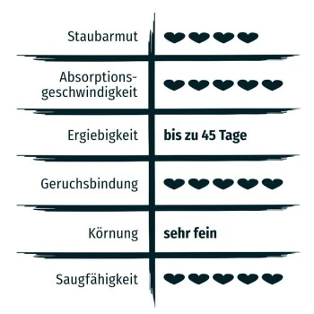 - Extrem gute Geruchsbindung durch 3 % Silikat