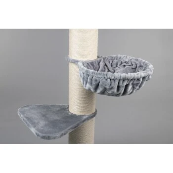 Ganz oben ist einen Liegeplatz mit herausnehmbares waschbares Kissen befestigt mit Klettverschluss. Die drehbare Liegemulde ist eine Kombination aus einer Hängematte und einem Kissen. Der Traum von jeder Katze! Diese Liegemulde wurde extra mit einem Metallrahmen verstärkt und auf eine Tragfähigkeit von 20kg getestet! Die gesteppte und gepolsterte Hängematte ist bekleidet mit extra weichem Plüsch so wie auch die Liegefläche unten.
